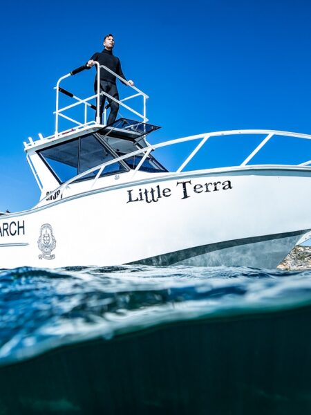 | Special features | Roof filming and spotting platform with fold down handrails for easy setup, walk around deck for filming & tagging, large back deck with mounting points, lockable cabin, shallow draft, reverse chine hull design for stability, commercial marine first aid kit & shark bite trauma kit, diver GPS unit, easy access dive door and ladder. |